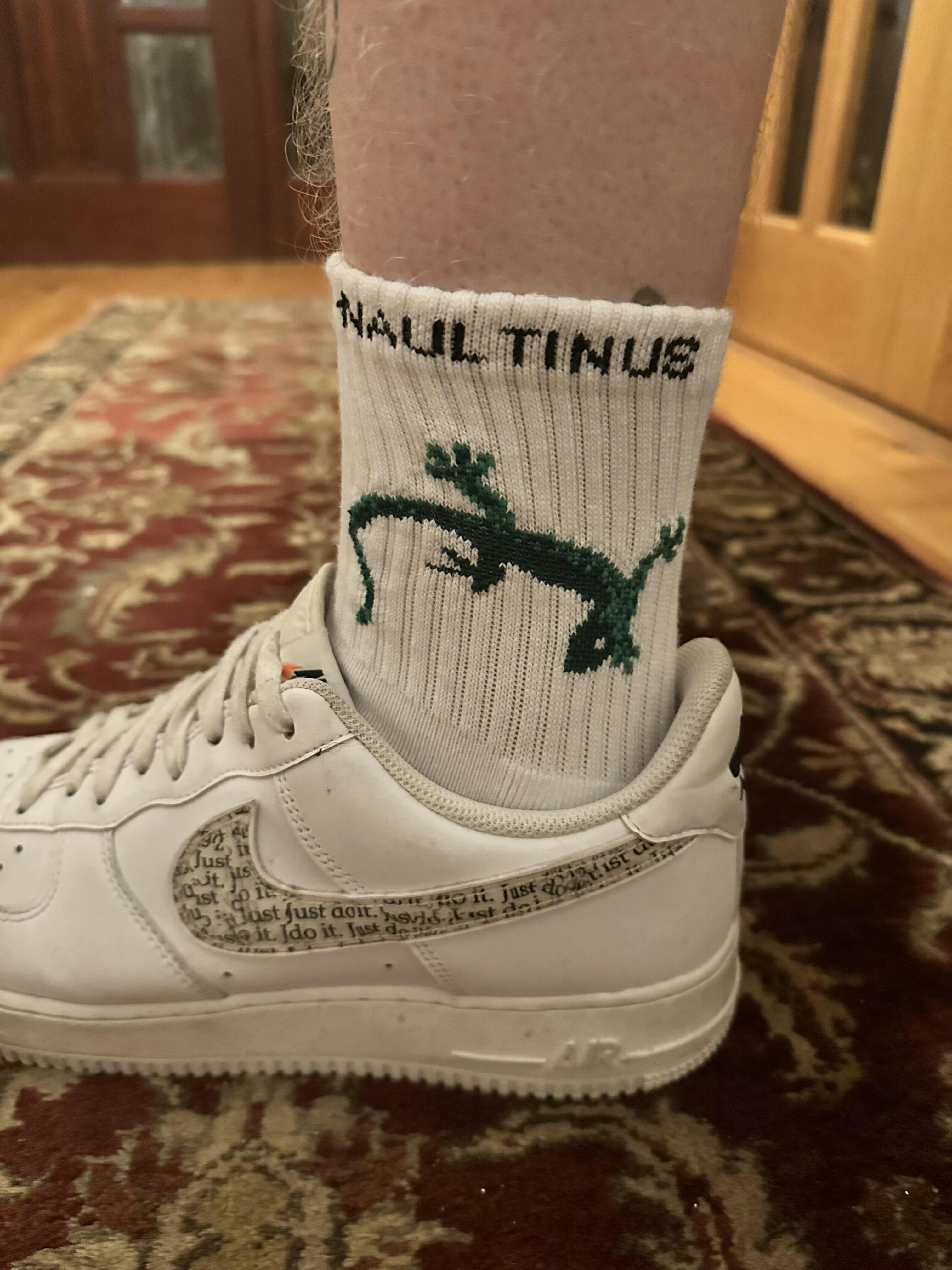 These white Naultinus Socks feature a subtle lizard design alongside the brand name, combining style with comfort. Perfect for adding a unique touch to your everyday look